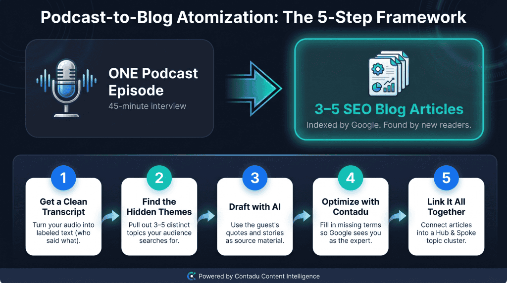 Podcast-to-Blog Atomization: The 5-Step Framework to Turn One Interview into Five Articles.